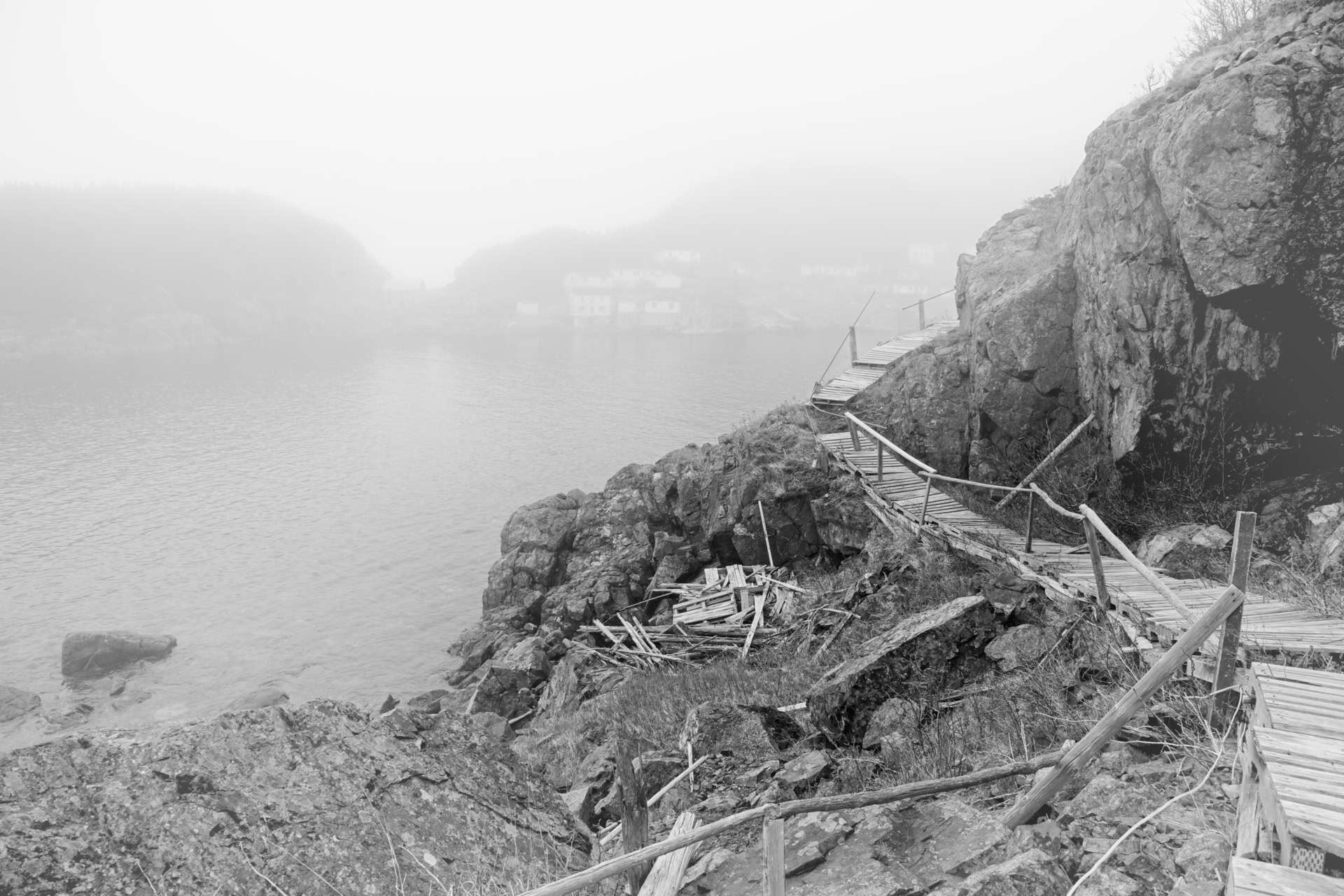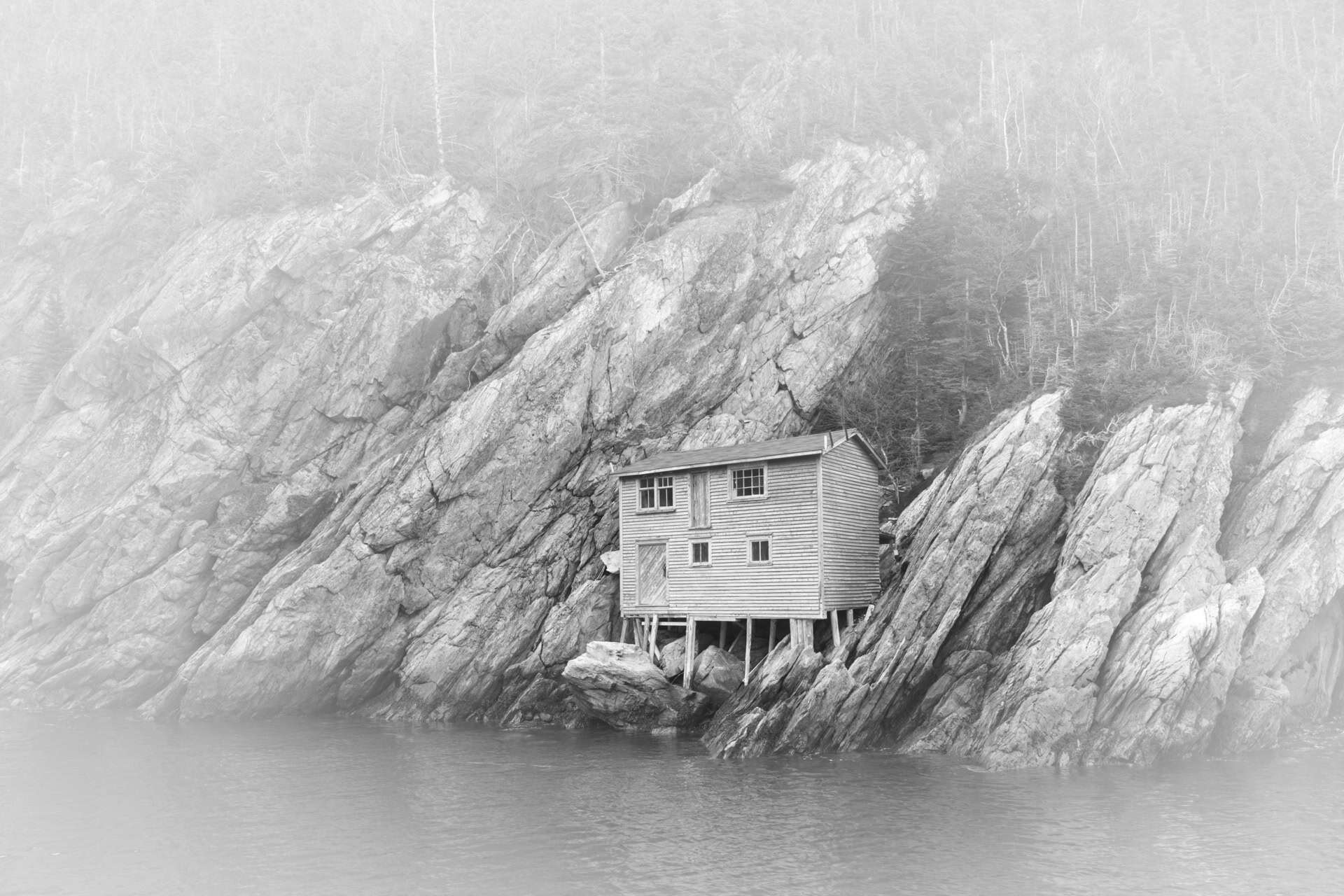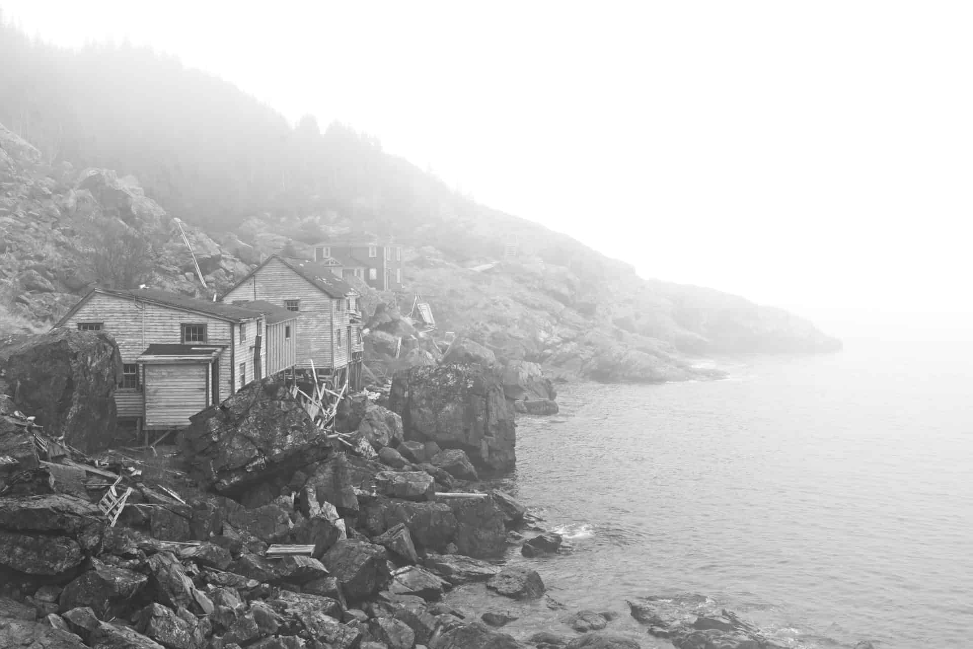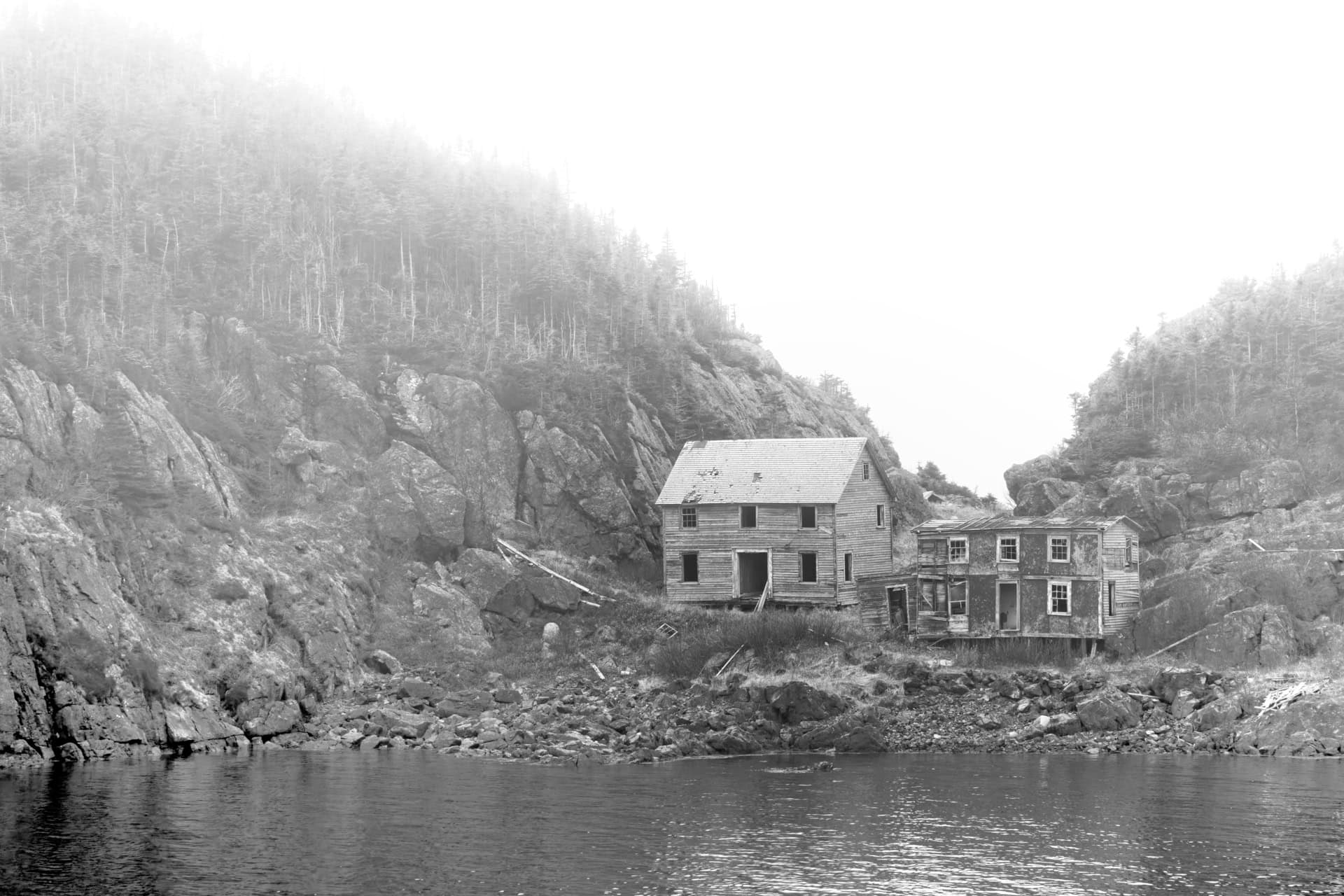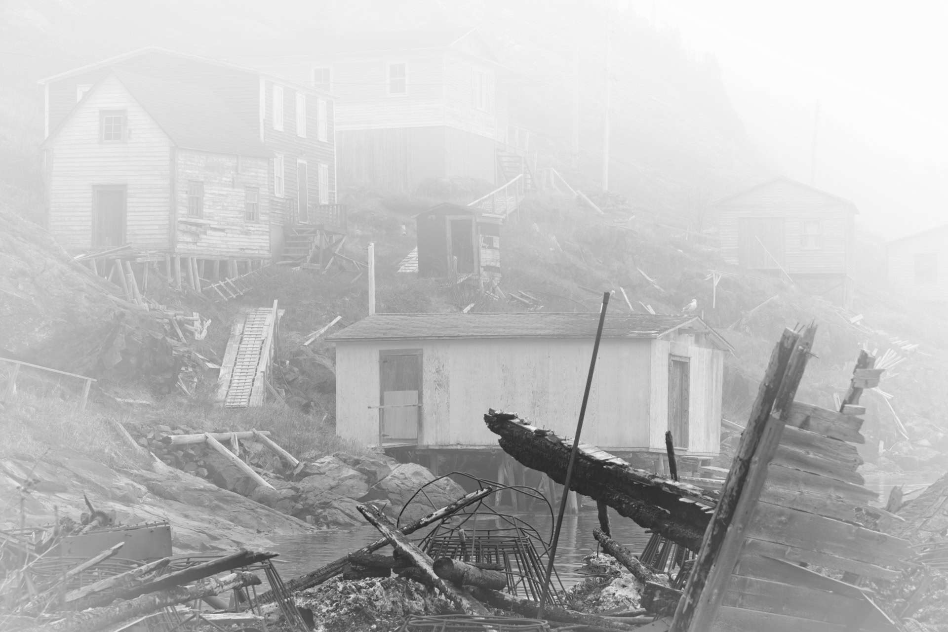 La surpêche de la morue à Terre-Neuve a conduit à un moratoire en 1992. Plus de 30,000 emplois perdus et plusieurs maisons de pêcheurs abandonnées. Trois décennies plus tard, les impacts étaient toujours visibles là où couraient les enfants, où la musique et les rires pouvaient se faire entendre. Avec le temps, la mémoire se perd. J'ai donc représenté cette réalité historique en noir et blanc, avec des scènes qui s'évanouissent en bordure, sauf pour les trois dernières légèrement colorées pour montrer les adaptations actuelles.